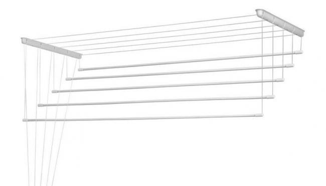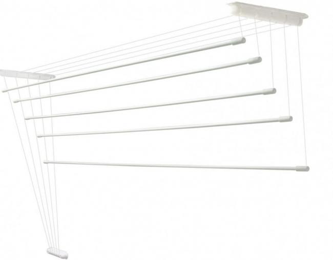 Веревочная модель российского производства имеет привычную горизонтальную конструкцию. Крепить ее можно не только к потолку, но и к стенам. Между двумя пластиковыми планками закреплены пять веревок, для размещения вещей. Данное изделие подходит исключительно для небольшого количества, малогабаритного белья. Идеально подойдет для сушки полотенец, платков, детской одежды. Часто используются в небольших ванных комнатах и дачах.