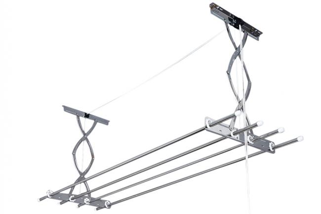 Такой вид сушилки отличается большей вместительностью и прочностью. Основа конструкции состоит из двух металлических перекладин, прикрепляющихся к потолку в нескольких местах. Они удерживают систему из роликов, через которую пропущены веревки лианы с перекладинами на концах. Конструкция удобна тем, что каждая рейка независима друг от друга и выдерживает вес до 3 кг. Держатель для лиан прикрепляется рядом, что позволяет с удобством пользоваться конструкцией и с легкостью выбирать высоту перекладин. Сама система выполнена из прочного металла, устойчивого к коррозии.