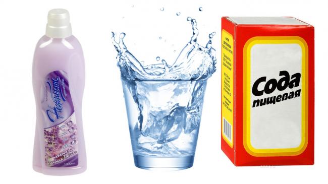 - Пищевая сода. Сода очищает и дезодорирует любые ткани. Рецепт: 6 чашек уксуса, 1 стакан соды, перемешать. Использовать 0,5 – 1 стакан полученной смеси на 1 цикл полоскания.