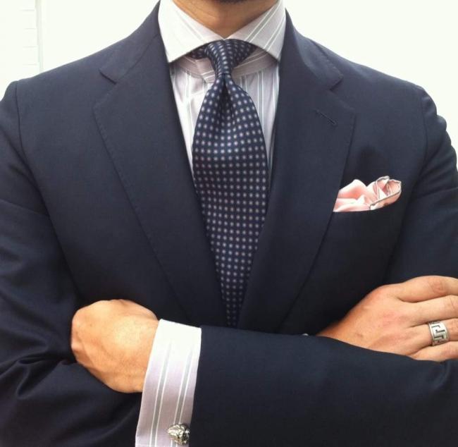 - светлый однотонный пиджак – рубашка средних тонов, а галстук темный;