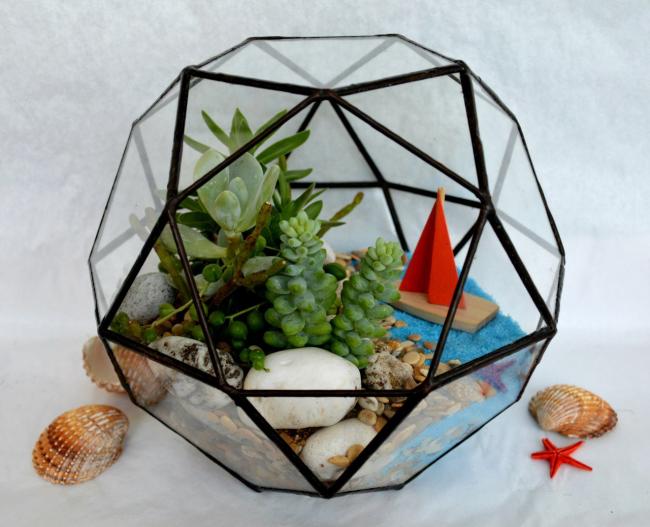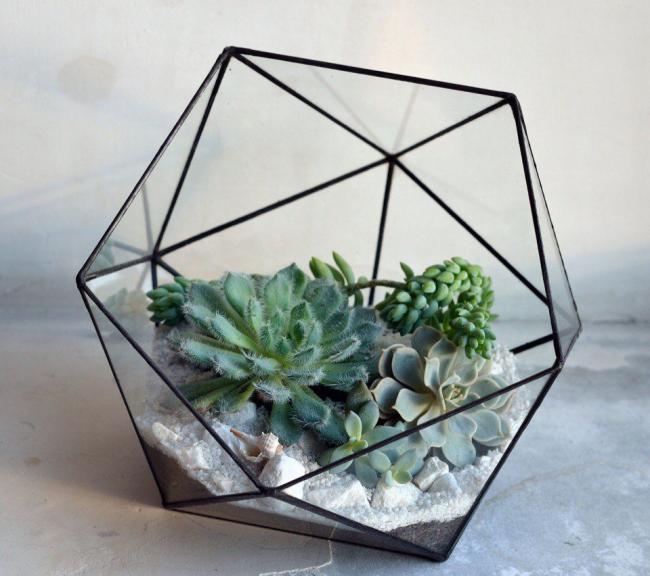 Выбор растений зависит от формы выбранной емкости, размере и непосредственно расположении в квартире. Так, для композиций, стоящих далеко от окна и солнечного света отличным решением будет развести лесные кактусы, ховея(кентия), аспидистра и т.д., а вот на окне или возле окна, отлично поведут себя: плаун, мимоза стыдливая, орхидеи и другие тропические растения.Можно обустроить сухой флорариум, тогда его растительность будет представлена в виде кактусов, суккулентов, а также подойдут агавы, эуфорбии и другие виды, выдерживающие экстремальную температуру, редкий полив. А вот посаженные в стеклянные емкости фиалки будут требовать регулярный полив, в связи с этим они прекрасно подойдут для влажных композиций. Если же вы являетесь фанатом экзотики, то для стеклянного сада можно подобрать растения, которым скармливаются насекомые, — квартира точно станет оригинальной и уникальной, подобное мало где встретишь. Не стоит совмещать растительность приспособленную к различным экосистемам, этим вы погубите их.Хорошо с флорариумом разобрались и поняли что это универсальный террариум для растений, выполненный в необычной форме. Теперь поговорим о геометрических витражных формах.Витраж – вид монументального искусства, производство изображения из цветного стекла, как правило, рассчитанное на сквозное освещение, которое предназначено для заполнения проёма архитектурного сооружения.Геометрический витраж является разновидностью обычного витража, с той лишь разницей, что обладает объемом и выполнен в виде различных сложных геометрических фигур.Связка “флорариум” + “геометрический витраж”, дает поистине впечатляющие изделия, которые не останутся без внимания, заинтересовав любого. Внешний вид и форма будет ограничиваться лишь вашей фантазией.На этом вводную часть заканчиваем. Теперь подробно поговорим о мини террариуме в качестве подарка. Если вы ищите подарки близким, друзьям, знакомым. Вам хочется преподнести нечто нестандартное, необычное, доставить море положительных эмоций. Смело дарите флорариум!Его можно подарить как девушке, так и парню, данный презент будет хорош для друзей, близких или просто знакомых людей. Не сомневаемся, данный презент вызовет изумление, восторг и море положительных эмоций! Данный подарок запомнится надолго. Маленький оазис, всегда будет доставлять удовольствие даже в самые пасмурные и хмурые дни