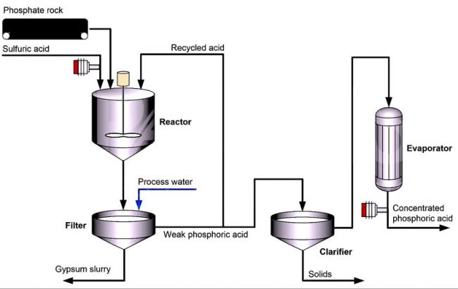 Затем добавляется обработанная вода, и гипс минерал из класса сульфатов, по составу гидрат сульфата кальция (CaSO4·2H2O) вместе с другими нерастворимыми примесями удаляется через фильтр. Фосфорная кислота, полученная этим мокрым способом, содержит 25-30% пятиокиси фосфора.