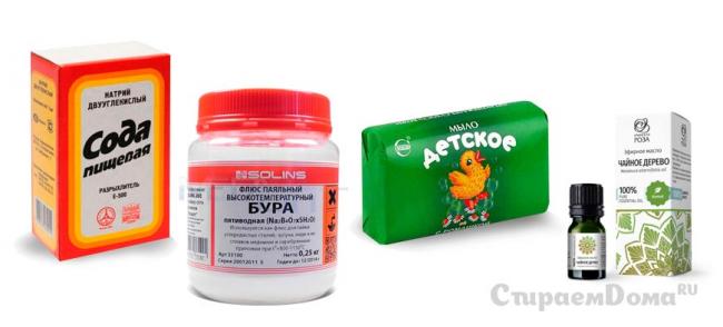 | Удаление пятен | — Бура (тетраборат натрия); — хозяйственное мыло |