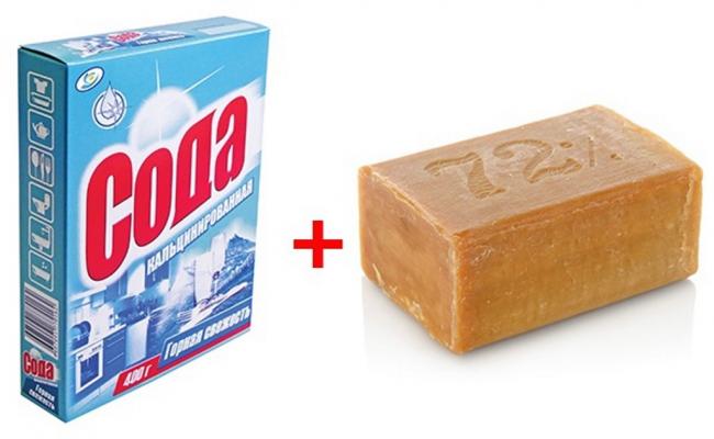 средство, приготовленное из хозяйственного мыла и соды, подходит для стирки постельного белья, банных полотенец, изделий из хлопчатобумажной ткани;
