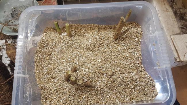 В коробки или ящики насыпают вермикулит, который станет надежной защитой для клубней. Главное, использовать крупнофракционный состав. На дно сыплют вермикулит, затем – георгины – потом опять вермикулит, далее – клубни, и снова слой защитного материала. Накрывают тару целлофаном.