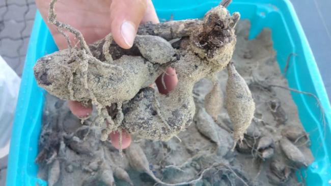 Когда приходит время выкапывать клубни, стебли обрезают так, чтобы оставалось примерно 20 сантиметров, и на них цепляют бирки, ранее прицепленные к кустам.
