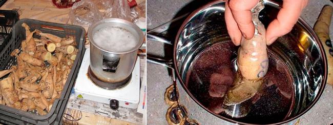 Разводим в емкости слабый раствор марганцовки. Обрезаем у корневища тонкие корешки и отростки. Опускаем его в подготовленный раствор на 20-25 минут.
