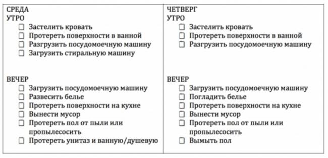 Как я уже говорила Выше, Вам нужно составить список дел, которые Вы будете делать только один раз в неделю. Я рекомендую разделить их выполнение равномерно на каждый день недели и тратить на выполнение такого дела 15-20 минут в день. Вы можете отталкиваться от вида занятия или комнаты (см. подробнее выше) или даже совместить их, как Вам будет удобнее.