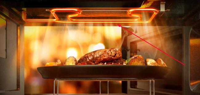 Кварцевый гриль оснащается компактной инфракрасной лампой. Нагревательный элемент не занимает пространство камеры, потому что размещается за металлической решеткой в верхней стенке камеры. Кроме места он экономит еще и электричество. Обжарка в таких печах деликатнее, а пища не пригорает. Однако мощность уступает ТЭНовому грилю.