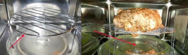 - чтобы получать равномерную прожарку со всех сторон, надо использовать опцию гриль в микроволновке совместно с конвекцией.