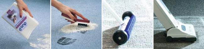 Втирают в ковер щеткой осторожно, чтобы не повредить структуру покрытия. Оставляют на два часа, затем пылесосят