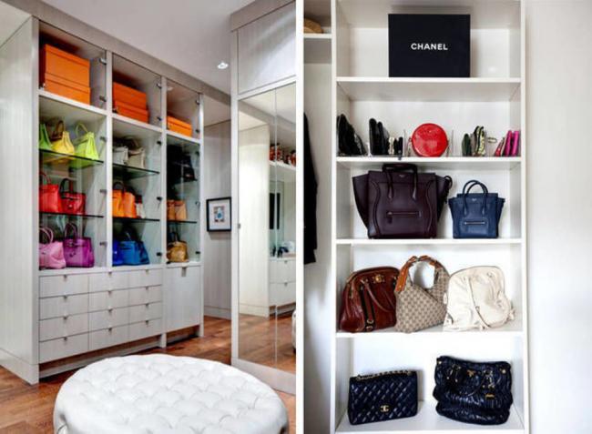 И последний способ — способ мечты: в отдельных секциях в гардеробной! Когда у каждого ридикюля, саквояжа и клатча есть свое место — это красиво и продлевает сумочкам жизнь.
