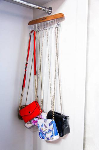 Следующий способ хранения — на вешалке для вещей. Такой вариант подойдет лишь для сумочек с ремешками (для клатчей придется искать другое место). Причем стоит учитывать, что сумки могут тереться друг о друга и царапаться, поэтому стоит компоновать мягкую кожу с мягкой кожей, а сумки с выступающими металлическими элементами вешать отдельно.