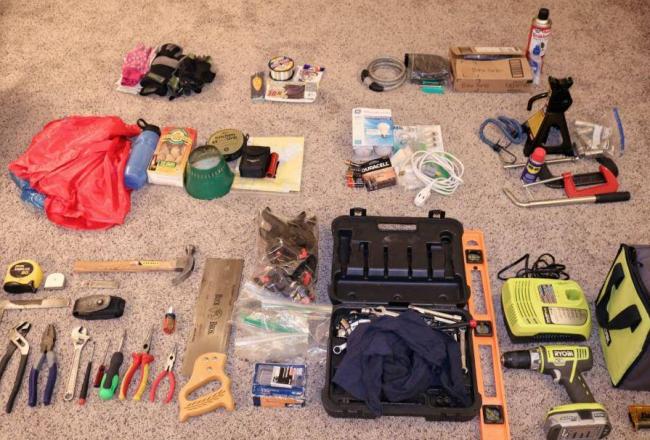 Инструменты выкладываются на полу в самом большом помещении, после чего собираются ящики для инструментов, корзины, коробки или другие емкости, которыми можно воспользоваться для укладки предметов.