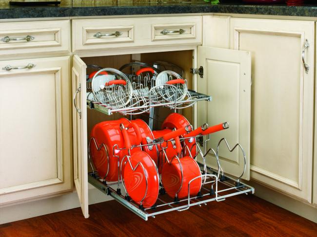 Если рядом с вместительным ящиком, в котором можно хранить кастрюли, есть небольшой отсек или полочка, то там можно расположить крышки. Делая мебель на заказ, такой отсек можно спроектировать заранее.