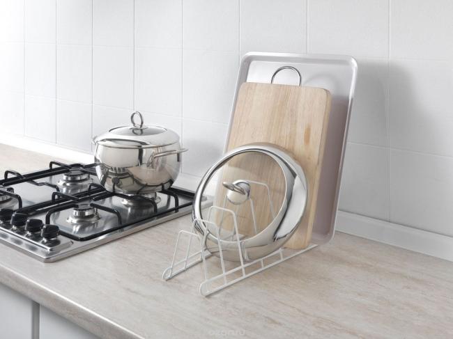 Вертикальные подставки под крышки от кастрюль удобны для маленьких кухонь. Самые популярные выполнены в виде лотка. На них можно сушить посуду или хранить ее постоянно. Лоток может стоять на столе, рабочей поверхности или внутри глубокого ящика.