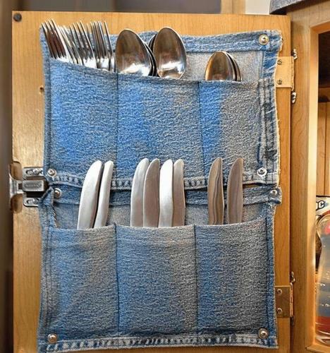Органайзер, сшитый из джинсовой ткани, смотрится очень стильно, тем более прочная ткань вполне способна выдержать значительный вес и весьма пригодна для хранения острых предметов – не порвется.