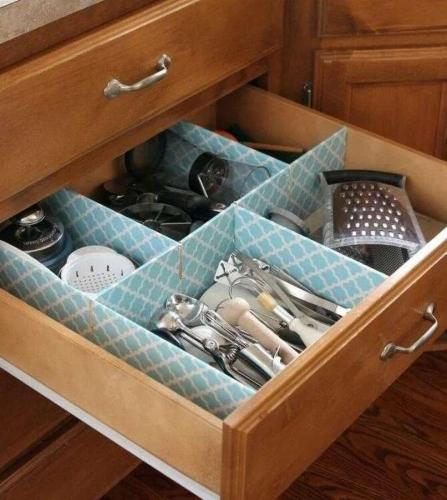 В любом ящике кухонной мебели можно организовать такое место для хранения кухонных принадлежностей разного типа. Разделители делаются из пластика или картона. Их можно обклеить чем-то цветным и красивым.