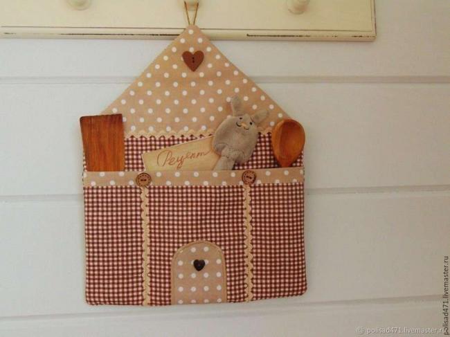 Милый органайзер из веселенькой ткани – отличное место для хранения кухонных приборов, а декор в виде деревянных пуговиц перекликается с деревянными предметами кухни, которые здесь хранятся.