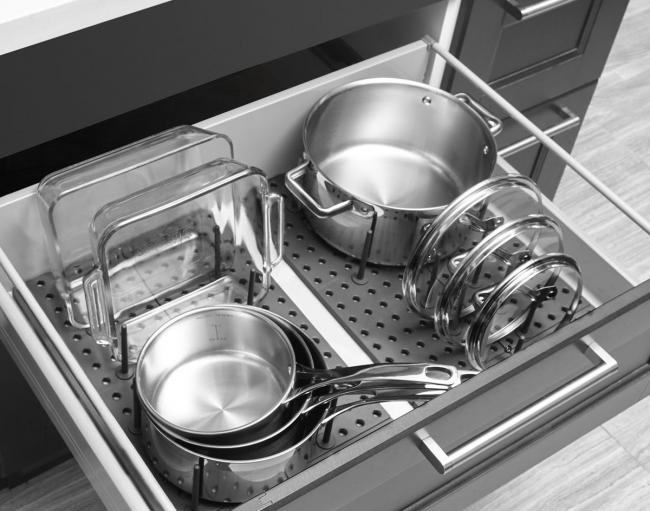 Разделительная система позволяет самостоятельно регулировать размеры и толщину ячеек под крышки и сковородки. Другими словами, такие органайзеры можно перестраивать подобно конструктору, собирая наиболее подходящую структуру. Они выполнены из разных материалов, но преобладают пластик и дерево, металлические выглядят слишком громоздкими, однако существуют и такие модели. Они съемные, их легко убирать из ящика и мыть при необходимости.
