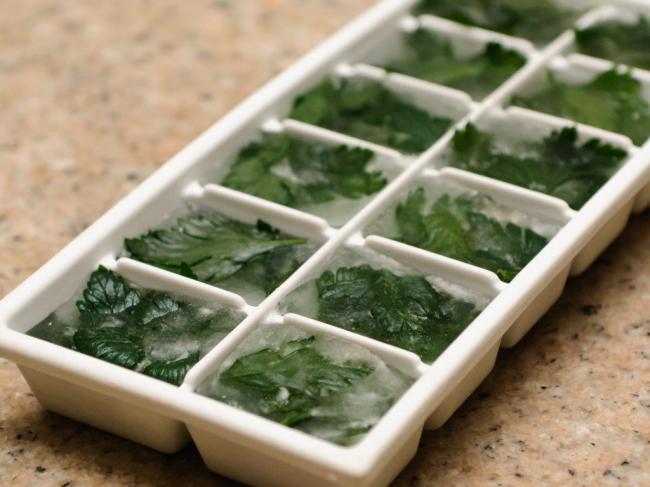 - Мелконарезанные листочки складываются в форму для заморозки и заливаются водой. После полно заморозки подготовленные кубики или иные формы перекладываются в отдельные пакеты.