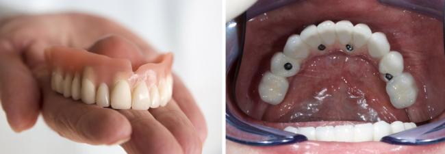 Частичные и полные съемные протезы делают по индивидуальным слепкам пациента. Их изготавливают из различных материалов: акрила, нейлона, металла и т. д. Преимущества таких конструкций: доступность цены, простота обслуживания.