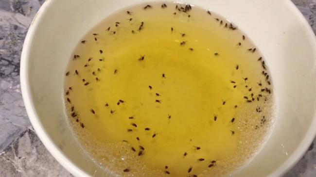- Из емкости с раствором для мытья посуды. В емкость, где осталось немного мыльного раствора, наливают яблочный уксус, компот, сок, вино и др. для привлечения плодовых мошек. Насекомые будут слетаться на приманку и тонуть из-за средства, которое снижает поверхностное натяжение жидкости.