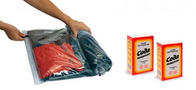 После этого поместить ее в целлофановый пакет, щедро пересыпав содой (понадобится 2-3 пачки). Равномерно распределить порошок, туго завязать мешок. Оставить в таком виде на сутки, не забывая периодически встряхивать содержимое.