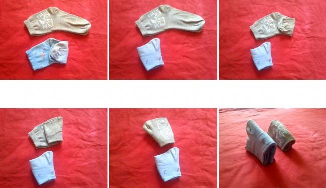 Техника похожа на предыдущую, только манжет верхнего носка нужно подогнуть, а пару очень плотно свернуть в рулон.