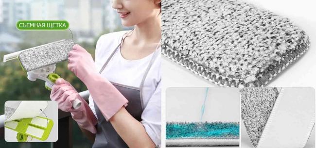 Максимальная длина ручки в таких изделиях может достигать 2 м. устройства имеют 2 насадки: первая, изготовленная из микроволокна, используется для влажной уборки, а вторая – с резиновым лезвием – помогает удалить с вымытых поверхностей остатки влаги, чтобы не оставалось разводов.