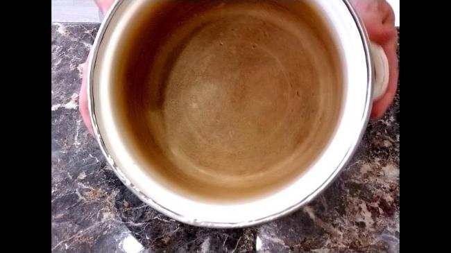 Отмыть кастрюлю от тёмного налёта внутри можно кашицей из горчичного порошка, сывороткой или лимонным соком. Эксперименты с отбеливающими химическими веществами лучше не ставить.
