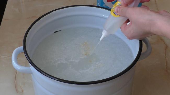 Наберите воду в ведро, в него опустите кастрюлю. Поставьте конструкцию на огонь. На терке измельчите хозяйственное мыло, добавьте его стружку и клей в кипящую воду. Смесь должна кипеть 30 минут, можно помешивать ее, чтобы состав распределился равномерно.