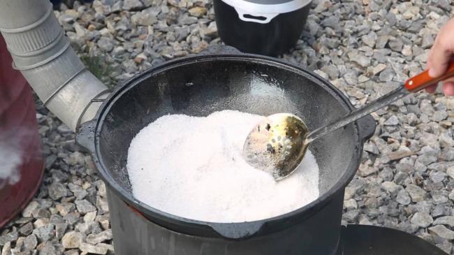 - Наполнить солью и поставить на огонь на 12 часов, периодически перемешивая. Процедура прекращается, когда вещество становится темным.