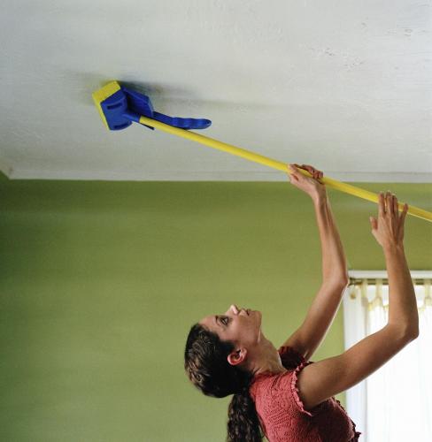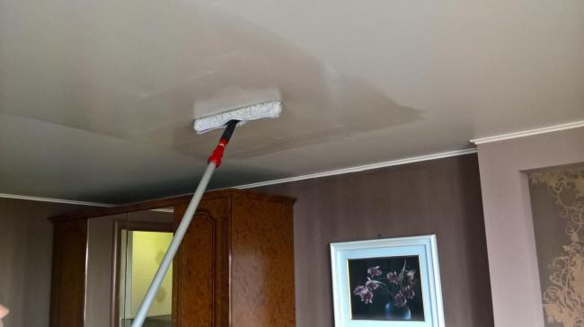 Перед началом уборки рекомендуется попробовать силы на малозаметном участке, так как при мытье потолка очень важно контролировать усилия при нажиме. Только так можно качественно очистить потолок от загрязнений и не повредить основное полотно.