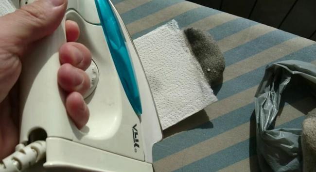 Воск имеет невысокую температуру плавления, что позволяет для его удаления с одежды использовать бытовой утюг. Для этой цели следует прибор нагреть до 60 градусов Цельсия. На загрязненный участок вещи следует положить бумажную салфетку, накрытую сверху небольшим лоскутом ткани. Нагретым утюгом следует прогладить загрязненное место несколько раз, до тех пор пока воск не перейдет с ткани на бумажную салфетку. При необходимости салфетку в процессе выведения пятна следует заменить на чистую.