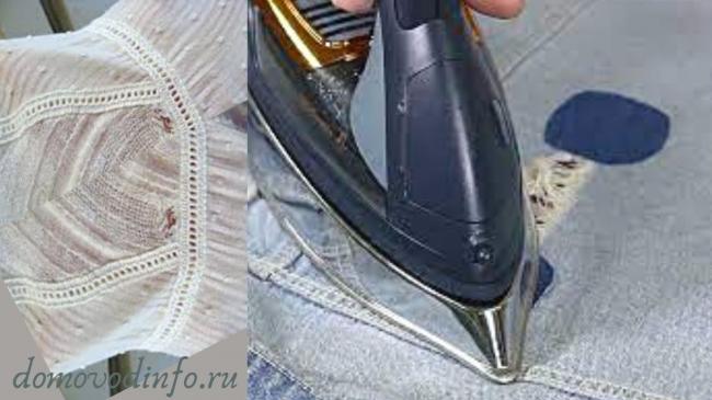 Изделия из синтетики нельзя подвергать горячей обработке. Перед проведением процедуры нужно посмотреть на бирку и выставить на утюге допустимую температуру. Либо можно нагревать пятно с помощью фена.