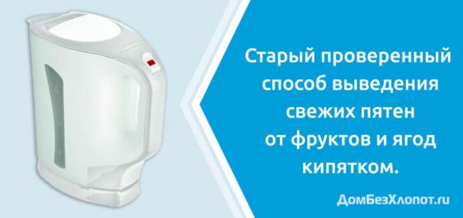 Воду в чайнике доводят до кипения. Вещь растягивают над любой вместительной емкостью (тазом, кастрюлей), тонкой струйкой льют горячую воду прямо на запачканный участок, пока темные следы не исчезнут.