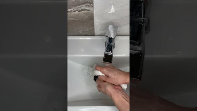 - Начните тереть загрязнение руками, затем сполосните под проточной водой.