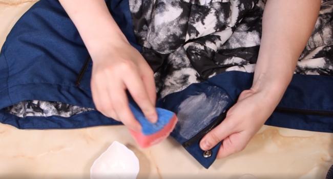 - Нанесите состав на испачканную одежду и оставьте ее в таком состоянии на 15 минут.