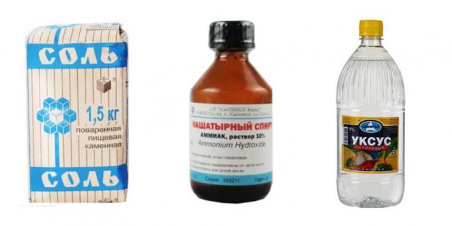 - Возьмите поваренную соль, нашатырный спирт, уксус. Смешайте компоненты в соотношении 1:4:4.