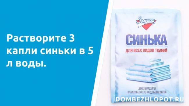 - Далее приготовьте раствор: 3 капли синьки на 5 литров воды (на упаковке есть все необходимые инструкции, так что не запутаетесь).