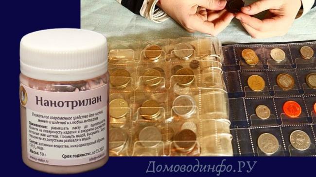 Паста Нанотрилан содержит щавелевую кислоту, микродисперсные абразивные вещества. Подходит для очищения денег СССР, новых 10-рублевых и иностранных денежных знаков. Наносят на загрязненное покрытие, аккуратно растирают фланелью.