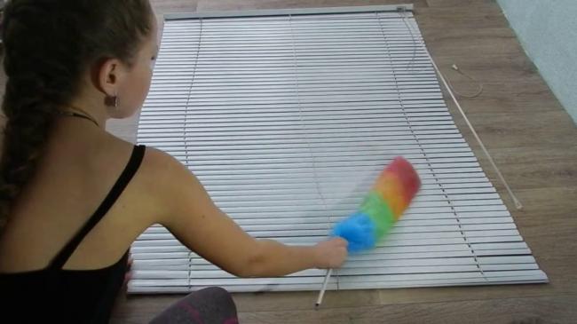 - Периодически протирайте пыль. В идеале это надо делать раз в неделю. В таком случае на поверхности ламели не осядет толстый слой пыли, а потому стряхнуть его будет намного проще;