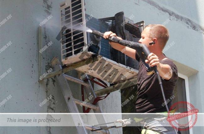 Очистка наружного блока кондиционера с помощью моечной машины.