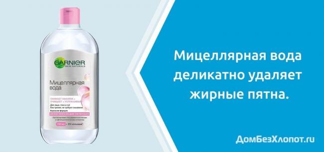Одними из самых трудных загрязнений (особенно на светлых куртках и воротниках) являются пятна от косметики и пота. Справиться с ними можно при помощи привычной многим девушкам мицеллярной воды. Это средство отлично удаляет остатки тонального крема или пудры с лица, так что, почему бы ему не справляться с такими пятнами на одежде. Этот способ чистки проводится локально вручную и не требует стирки в стиральной машине: