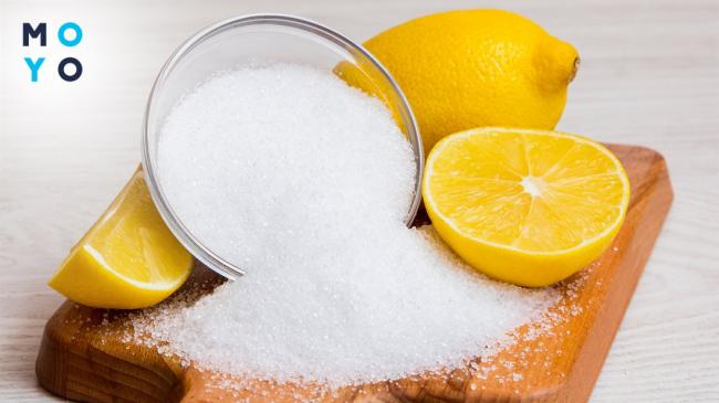 - В стакане воды размешивают 1 столовую ложку уксуса и 1 десертную ложку кислоты лимонной.