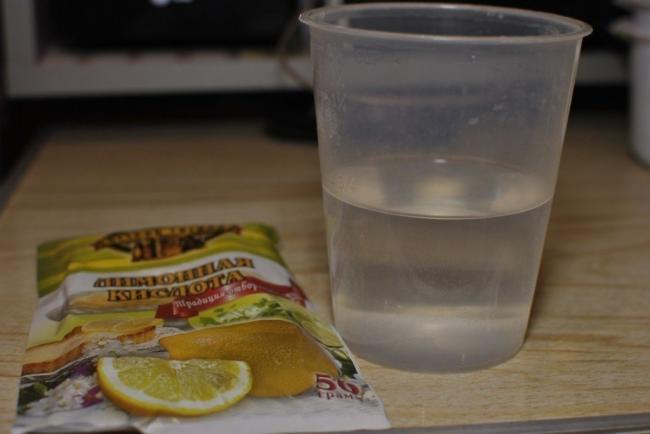 - Лимонная кислота. Добавьте пакетик кислоты в стакан дистиллированной жидкости, доведите состав до однородности, тщательно размешав.
