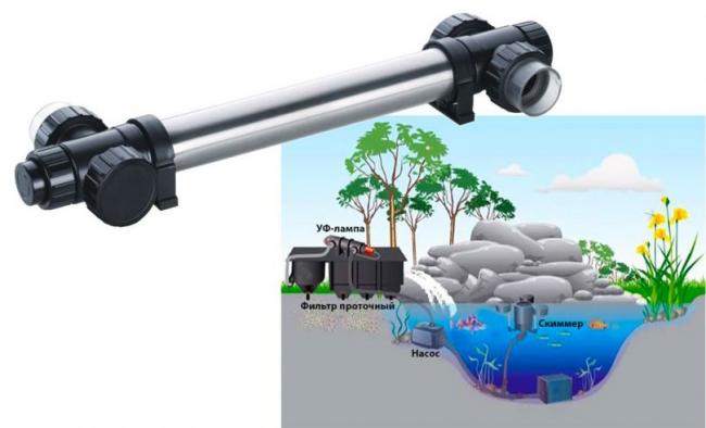 Как почистить водоем с помощью источников ультрафиолетового излучения? Как правило, для этого применяют специальный ультрафиолетовый фильтр. Выглядит он как сосуд, внутри которого размещена лампа.