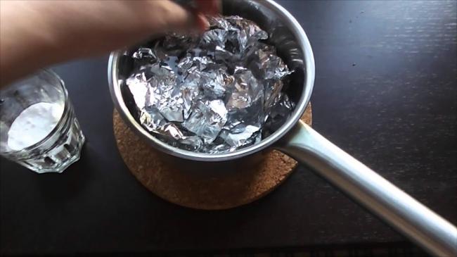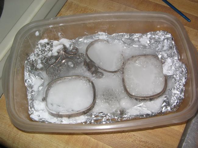 Сильно потускневшее серебро можно очистить следующим образом. Застелите кастрюлю фольгой и выложите серебро так, чтобы оно лежало в один слой и каждый предмет соприкасался с фольгой, но не дотрагивался до незащищённых ею участков емкости. Возьмите соду и соль в пропорции 2:1 и растворите эту смесь в горячей, но не кипящей воде. Залейте раствором кастрюлю (вода должна полностью покрыть предметы) и подождите 10 минут.