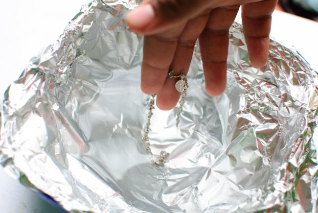 Возьмите небольшую глубокую миску и выстелите всю её поверхность фольгой. Сложите серебряные украшения в эту миску и засыпьте содой, чтобы порошок полностью покрыл их. Залейте соду кипятком и подождите завершения реакции. Когда сода перестанет шипеть (через 10 минут), достаньте очищенные украшения, промойте их чистой водой и просушите.